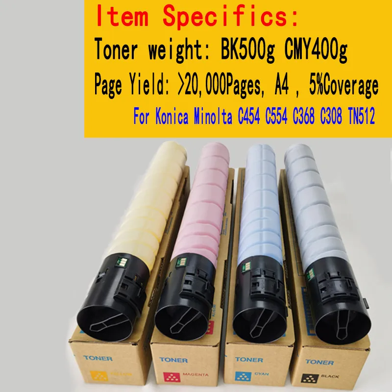 - 4 قطعة/المجموعة TN512 TN BK500g CMY400g خرطوشة حبر ل كونيكا مينولتا C 454 554 368 308 C454 C554 C368 C308 طابعة مسحوق تلوين البشرة
