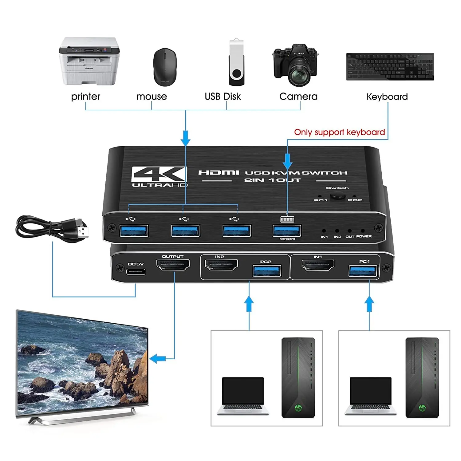 - USB3.0 مفتاح ماكينة افتراضية معتمدة على النواة 4K 60HZ HDMI2.0 2 المدخلات 1الإخراج مفتاح ماكينة افتراضية معتمدة على النواة لأجهزة الكمبيوتر المحمول/ال…
